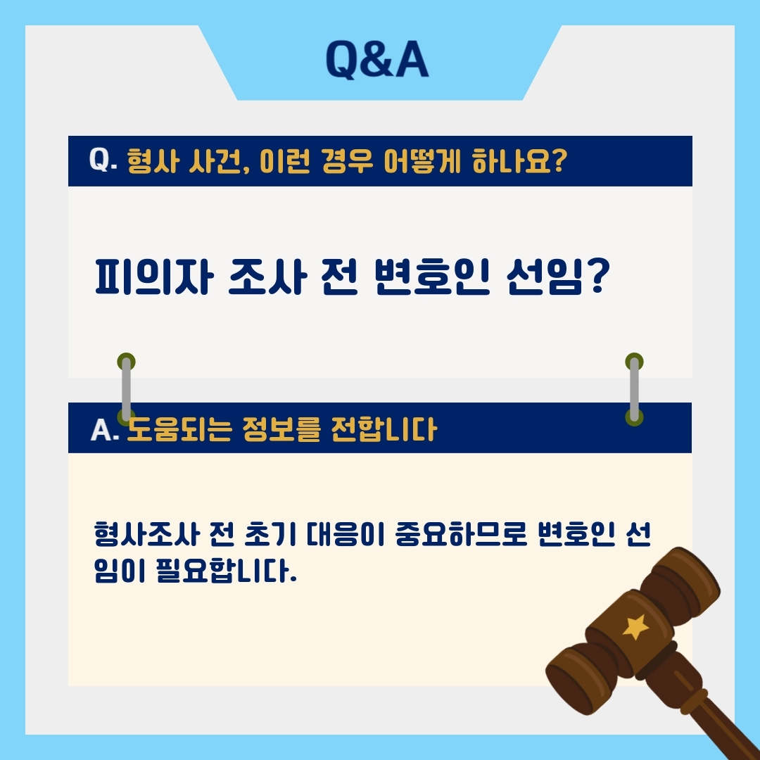 피의자 조사는 매우 중요한 절차이며, 변호인을 선임하여 조기에 법률적 조력을 받는 것이 자신의 권리 보호와 향후 절차에 유리하게 작용합니다. 경찰이나 검찰의 조사 통보를 받았다면 가급적 빠르게 형사전문 변호인과 상담하여 대응 전략을 세우는 것이 바람직합니다.